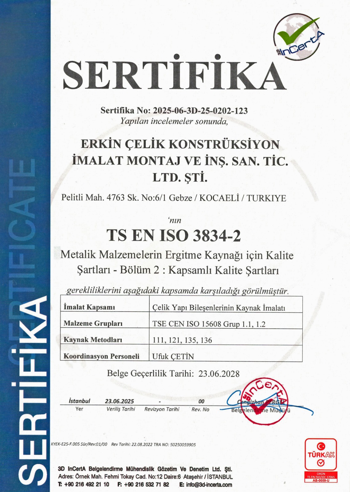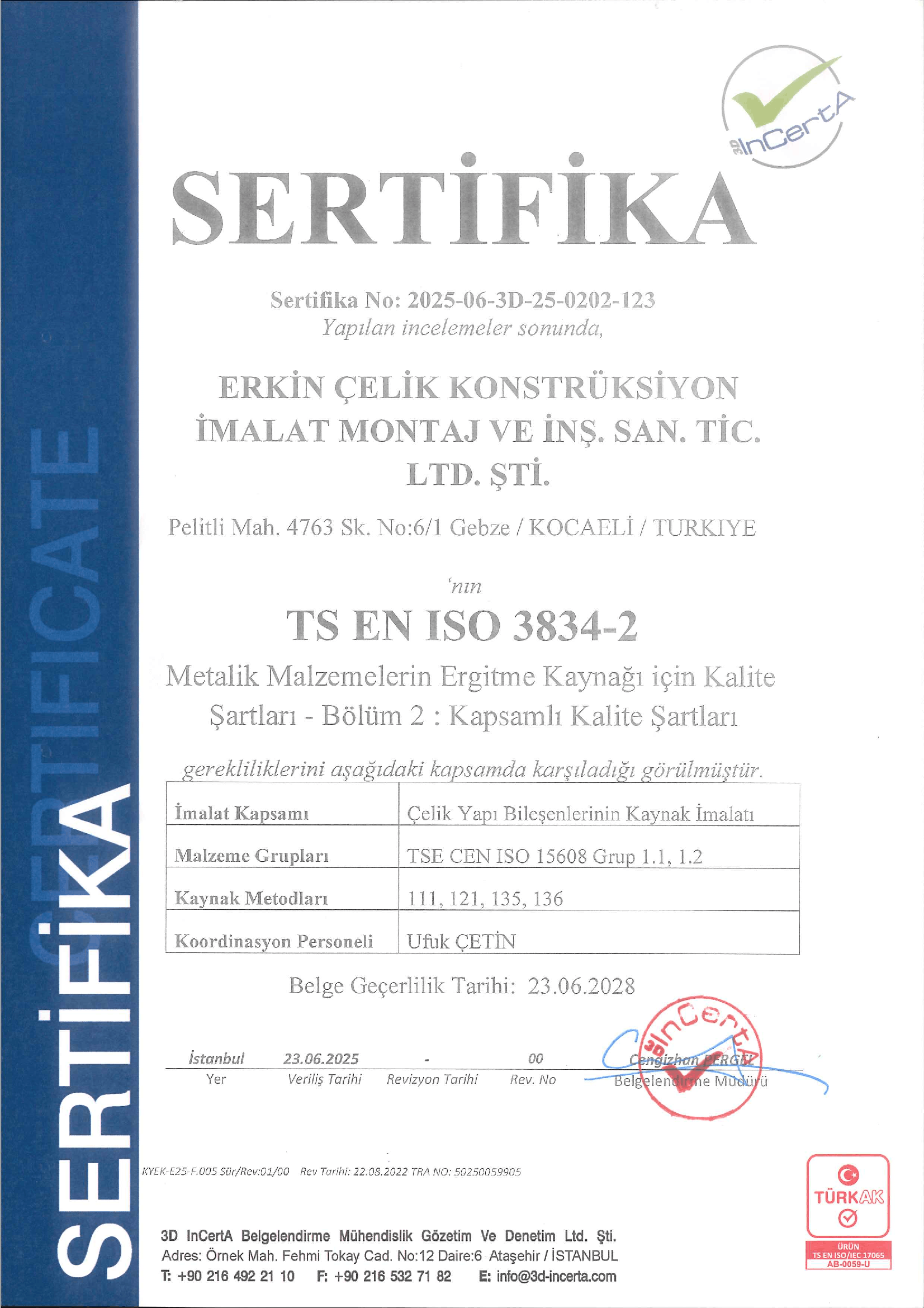 Çelik montajı konusunda uzman ve deneyimli kadromuzla, yurt içi ve yurt dışındaki şantiyelerde iş güvenliği, kalite ve zamanlama kriterlerini esas alarak projeleri planlı ve kontrollü şekilde başarıyla hayata geçirmekteyiz.
